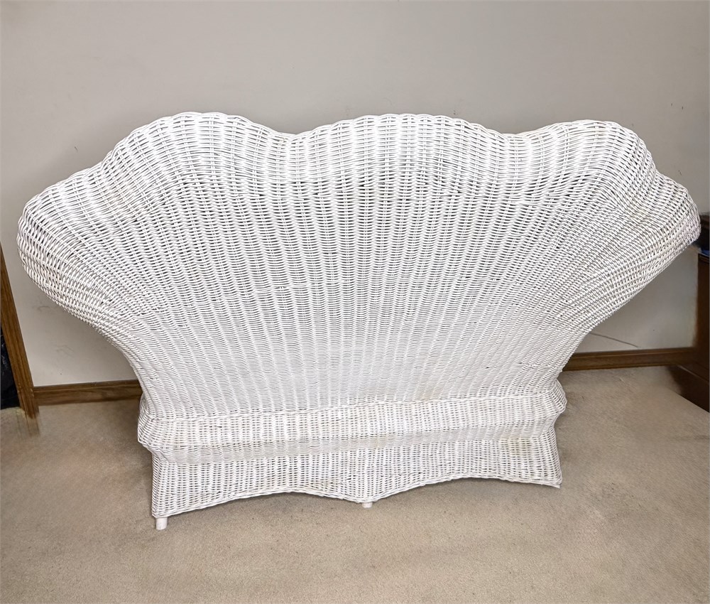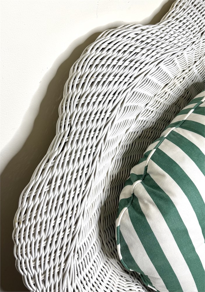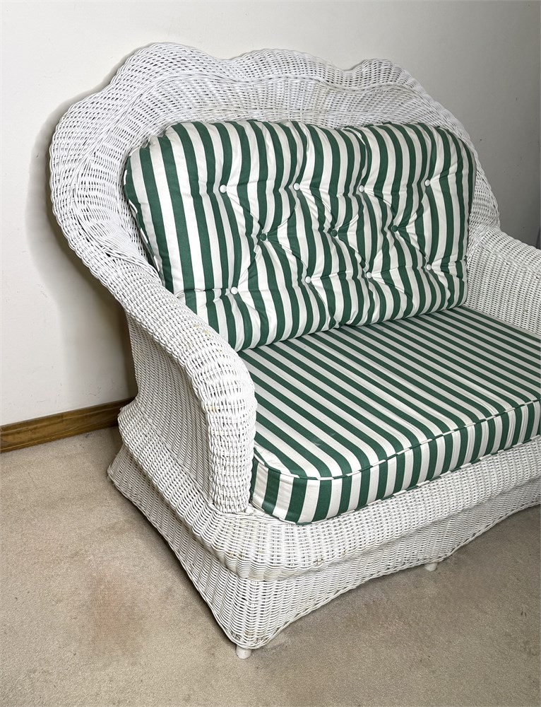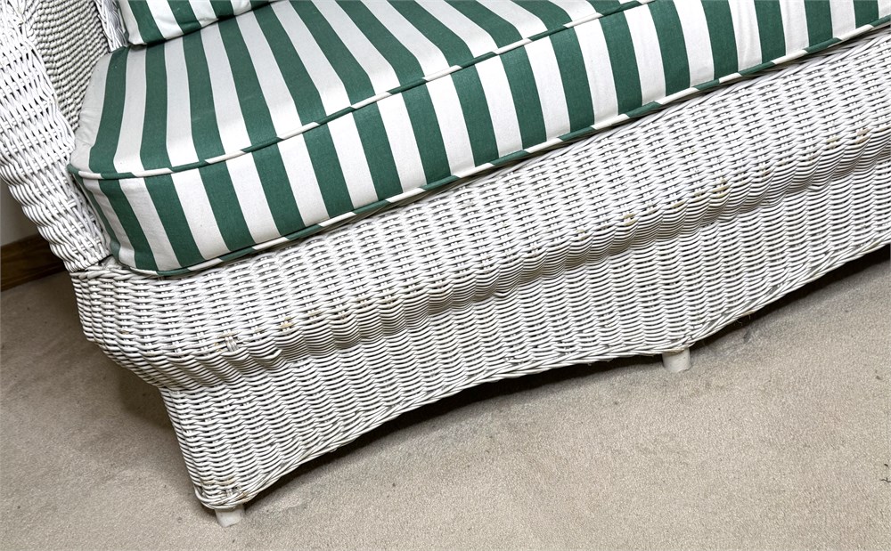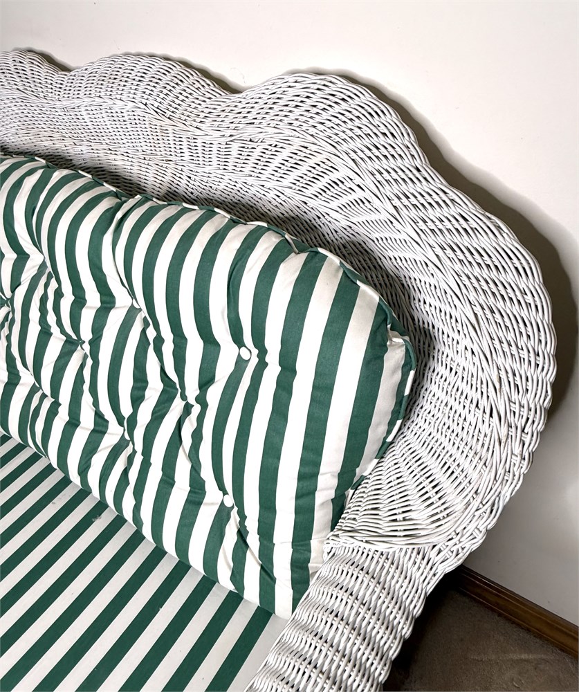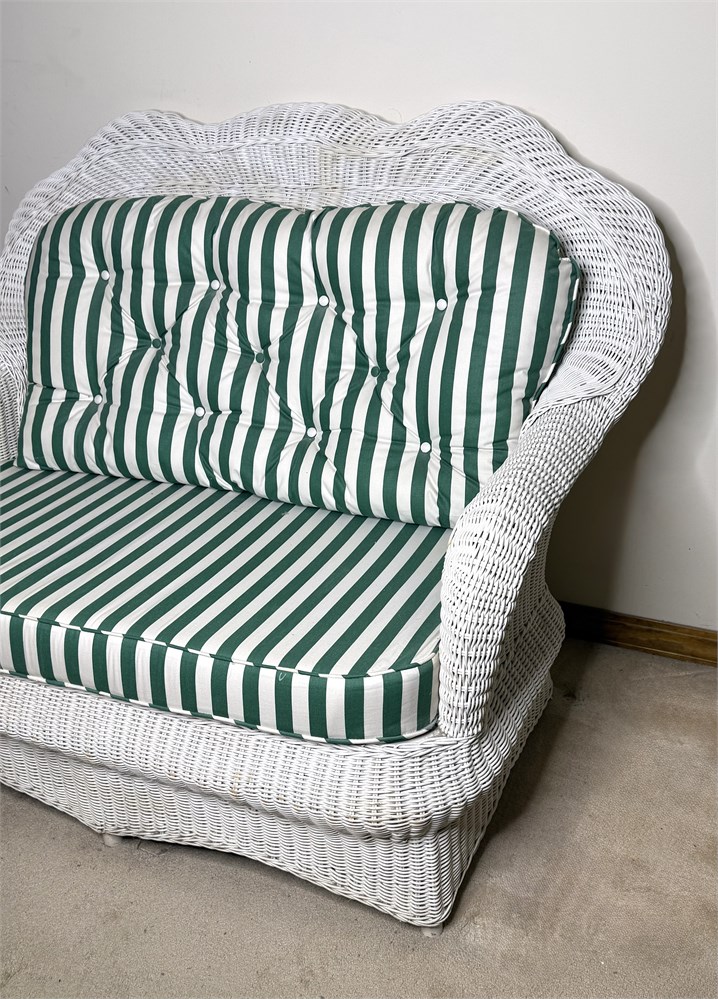 White Wicker Settee With Green and White Striped Cushion View Watchlist >