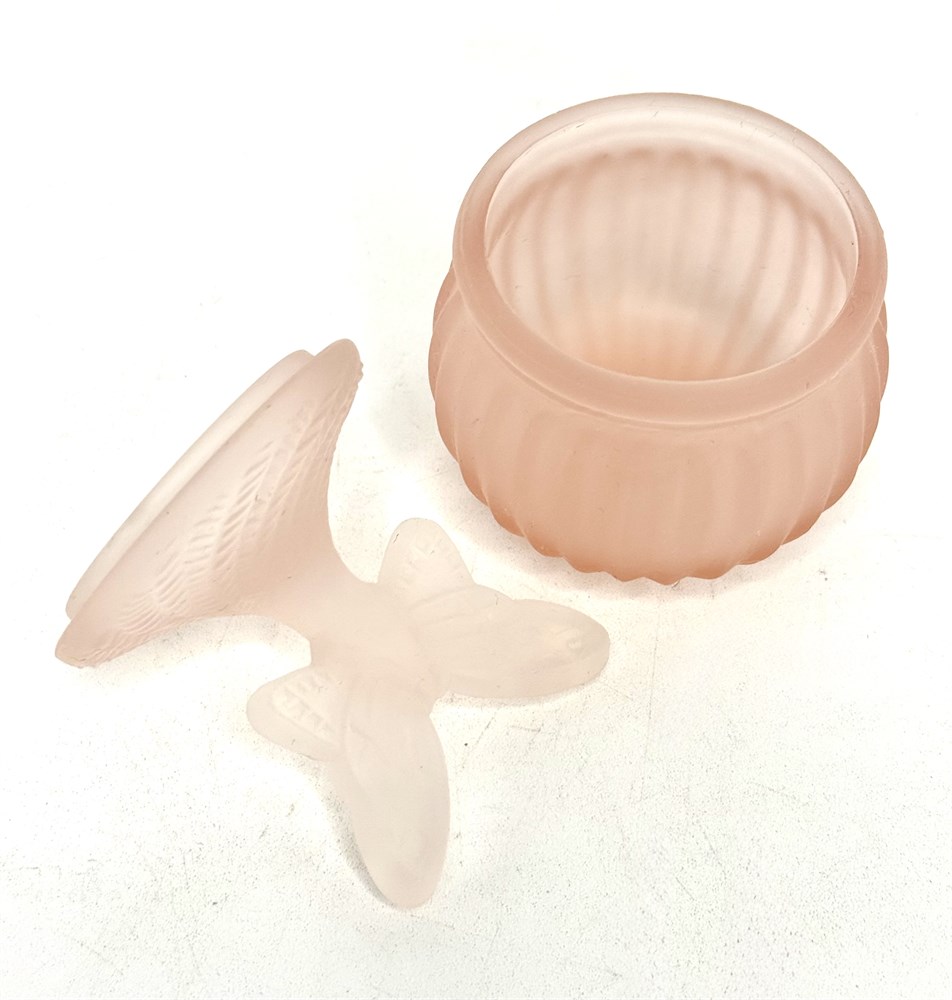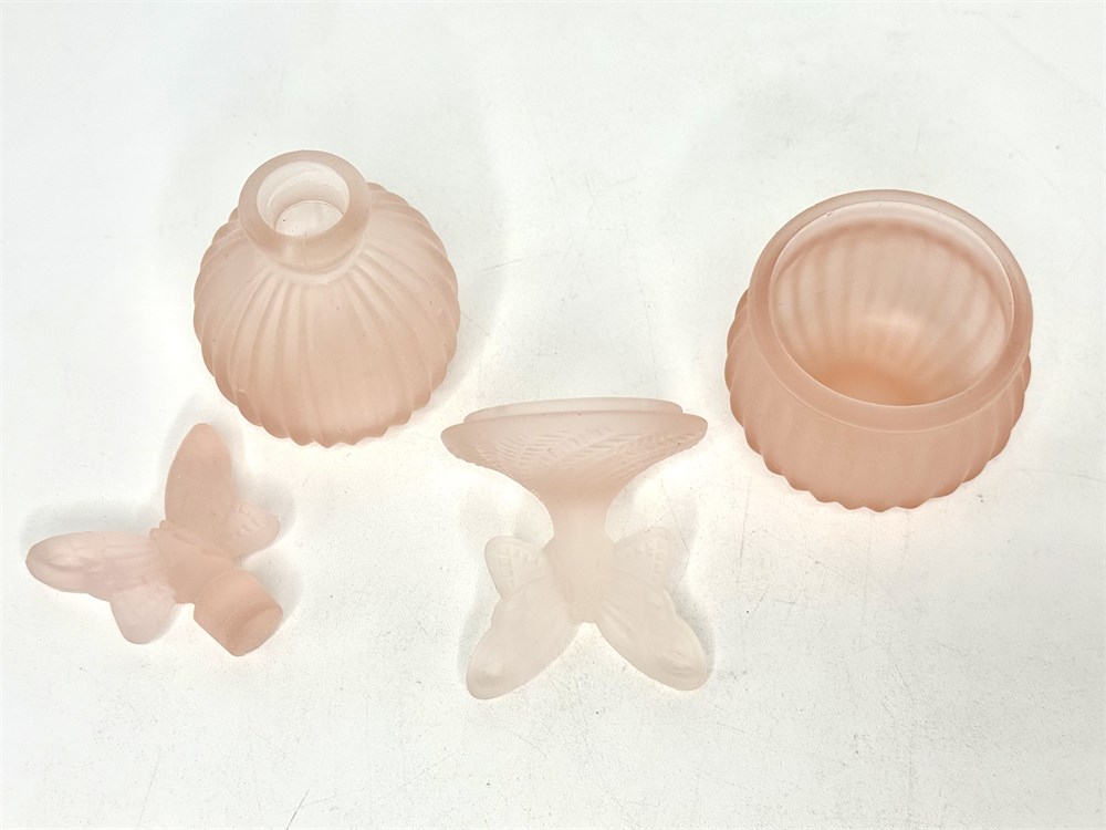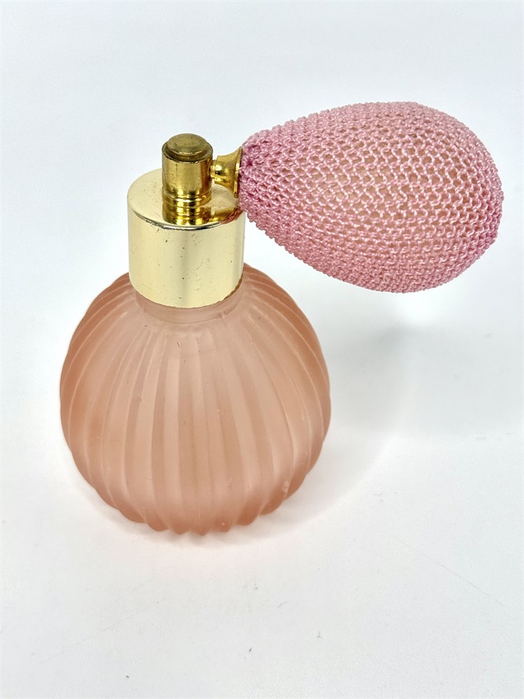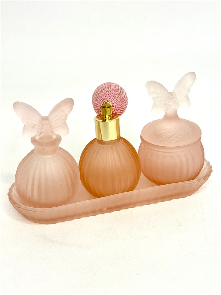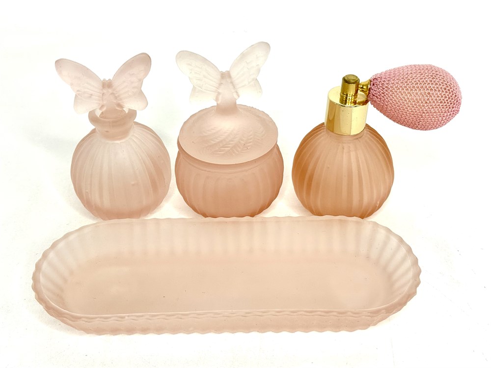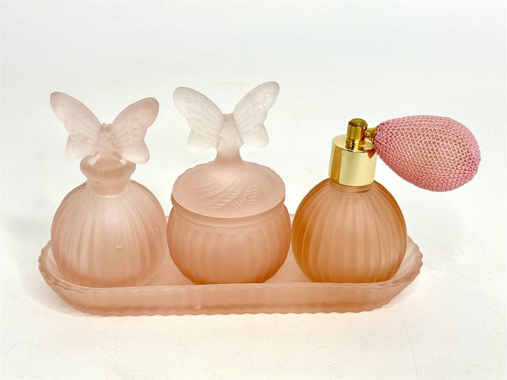 Vintage Pink Frosted Glass Perfume Bottle and Atomizer Set With Tray View Watchlist >