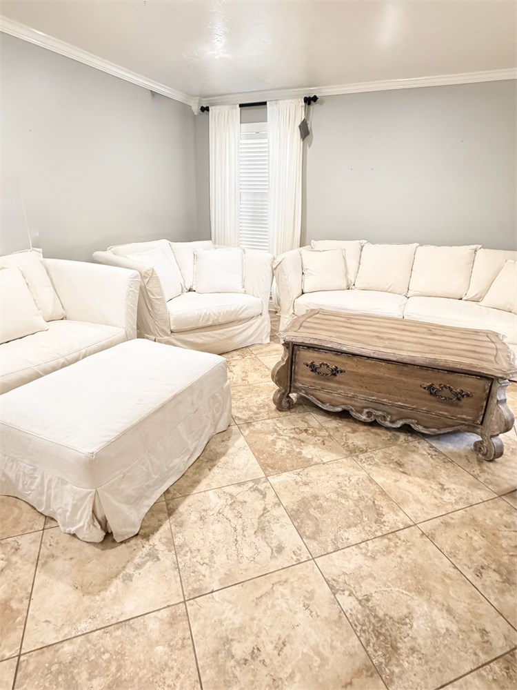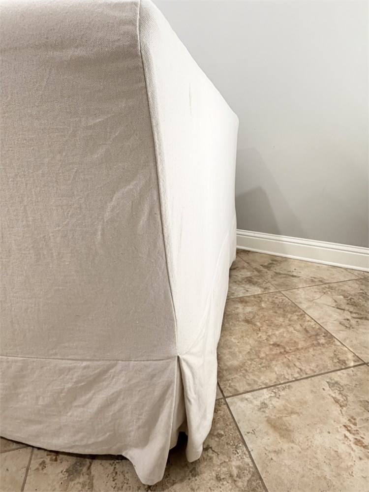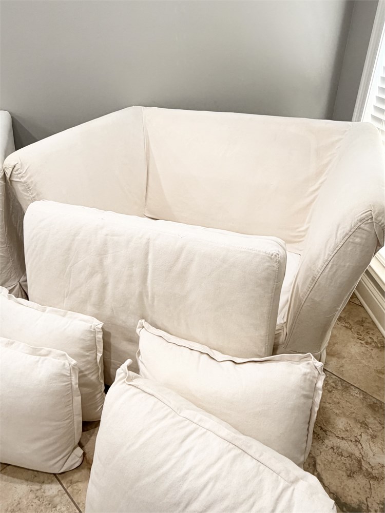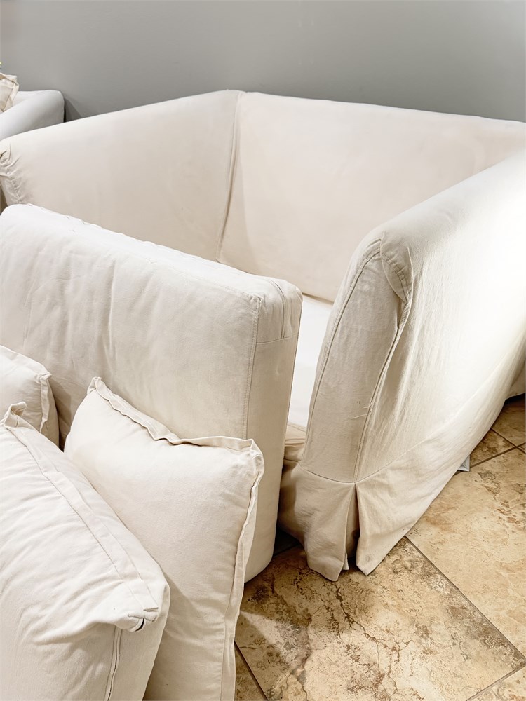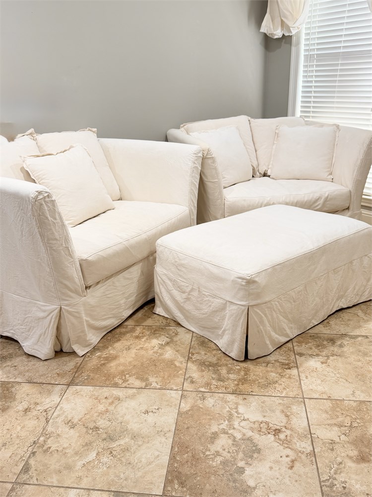 PACIFICA ~ (2) Tailored Linen Slipcover Loveseats / Oversized Chair With Ottoman View Watchlist >