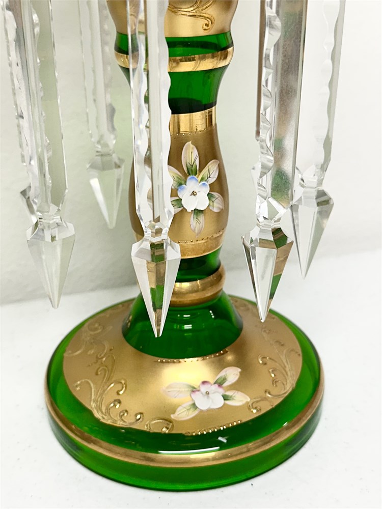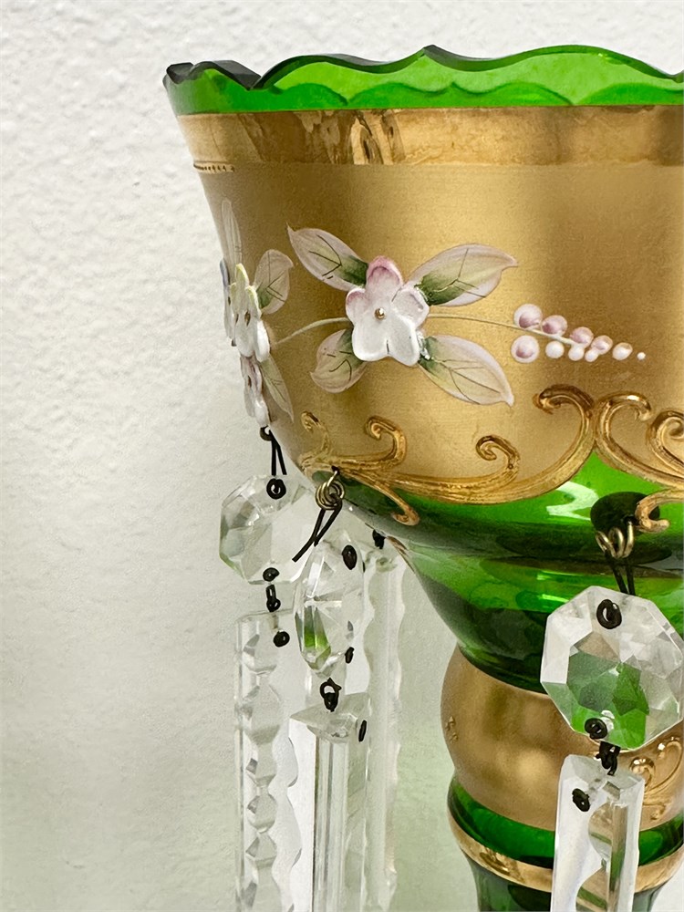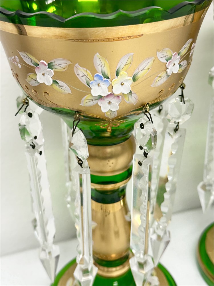 Pair 24K Gilded Gold Hand Painted Green Glass Lustre Vases View Watchlist >