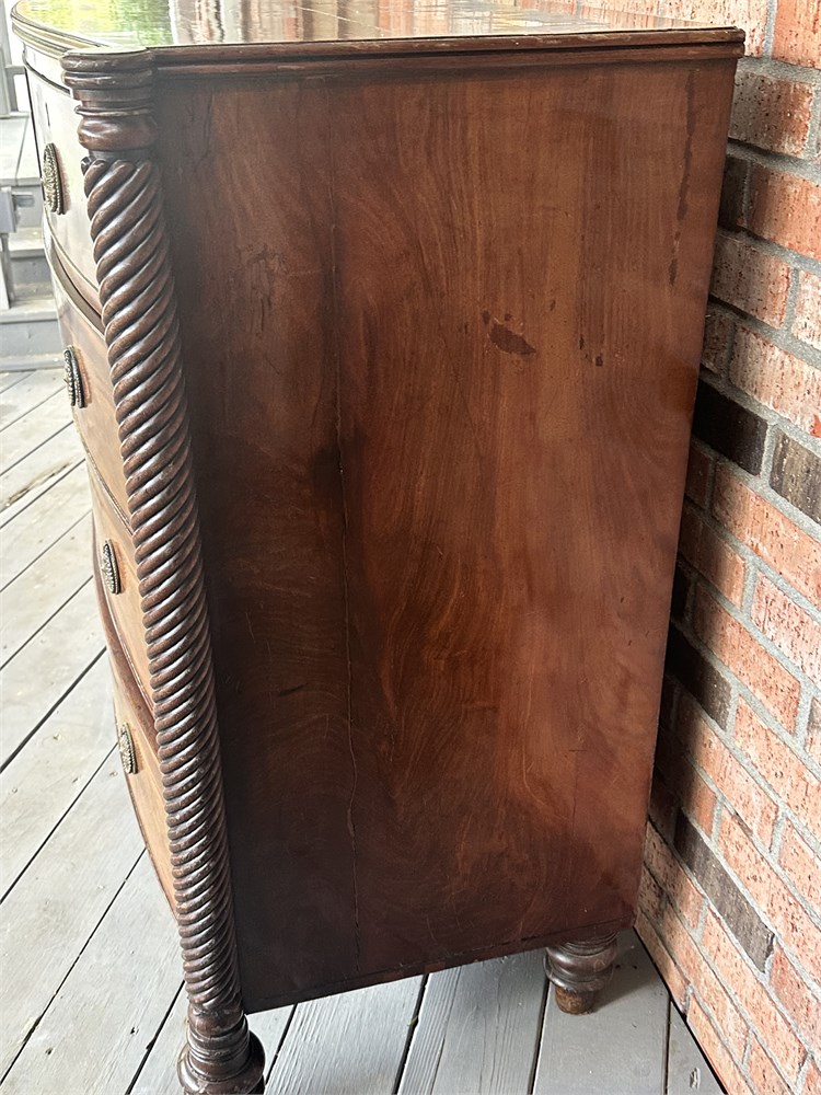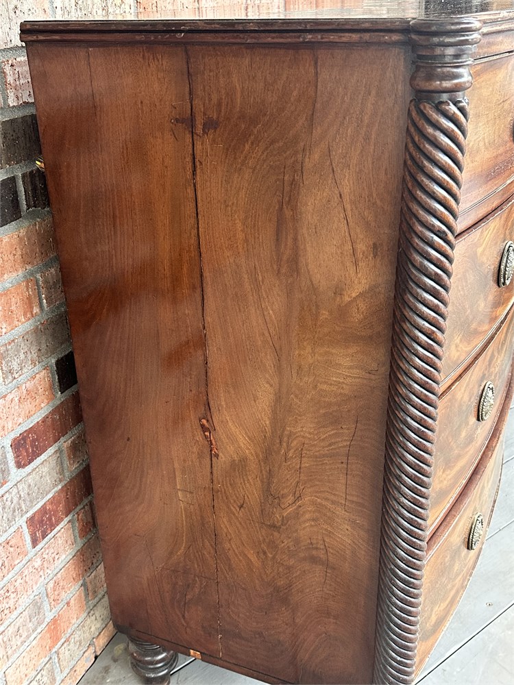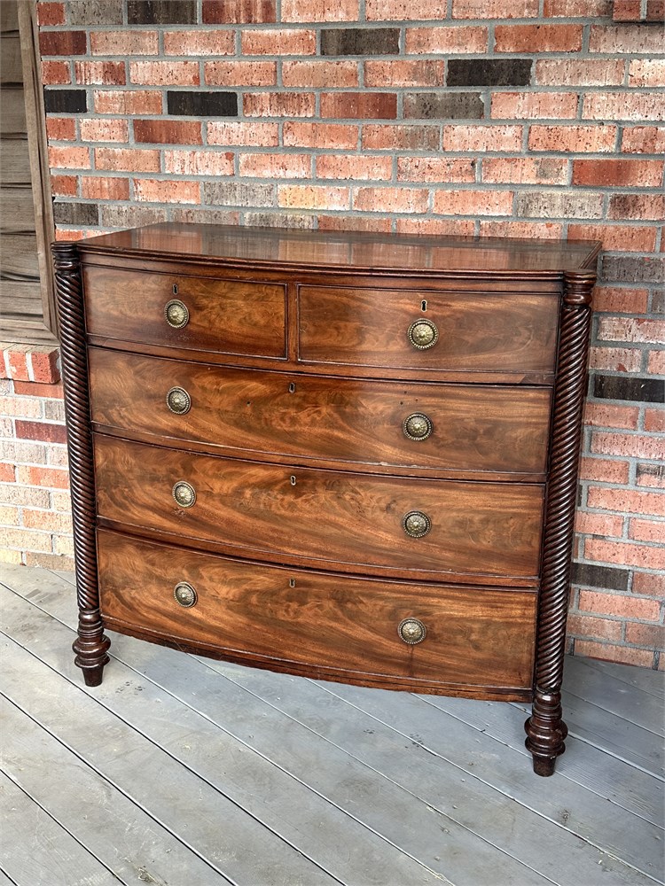 - It features a distinctive bow front design and flame mahogany veneers.