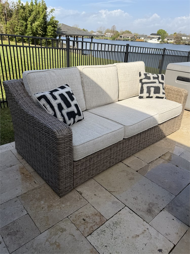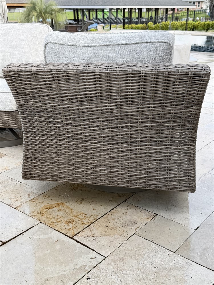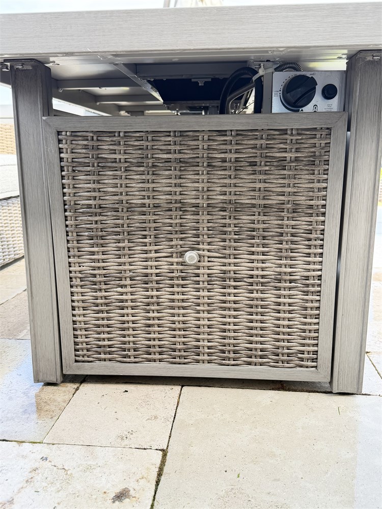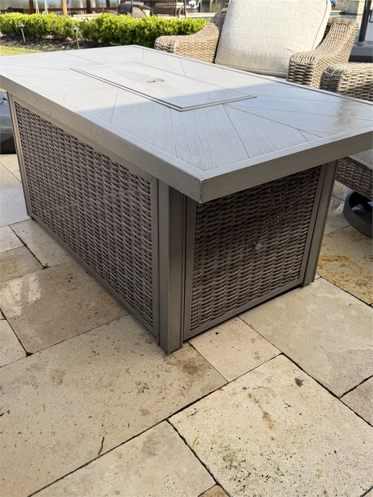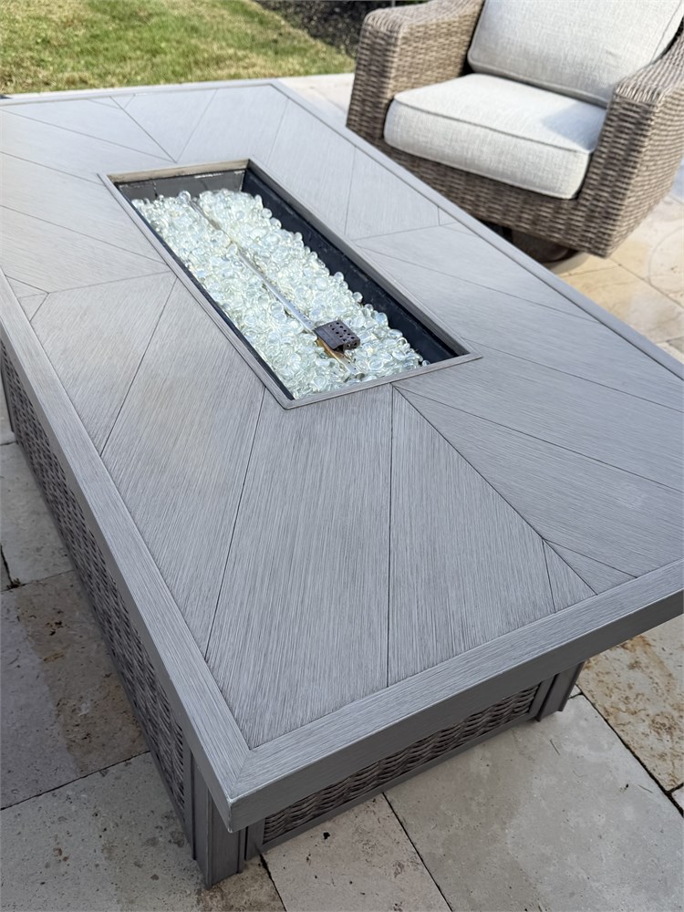 Set Includes = Sofa 30” H x 82” W x 37” D ~ Fire Pit Table 25” H x 58” W x 30” D ~ (2) Swivel Lounges 29” H x 39” W x 37” D ~ Cushions and 5” D ~ Cushions are removable for easy storage ~ Dog friendly home ~ Has been disinfected, deodorized & sanitized ~ Client states the fireplace does work