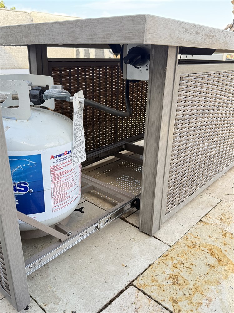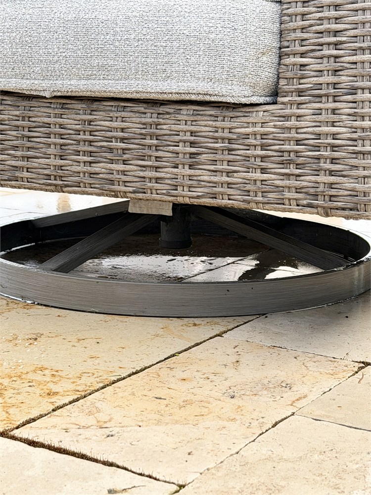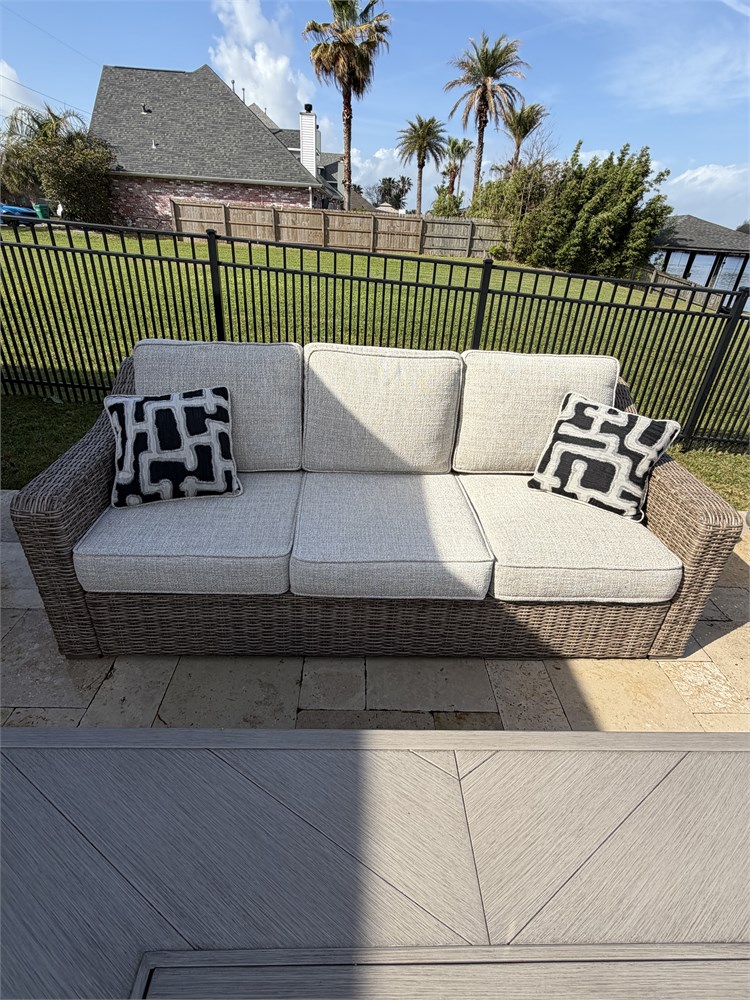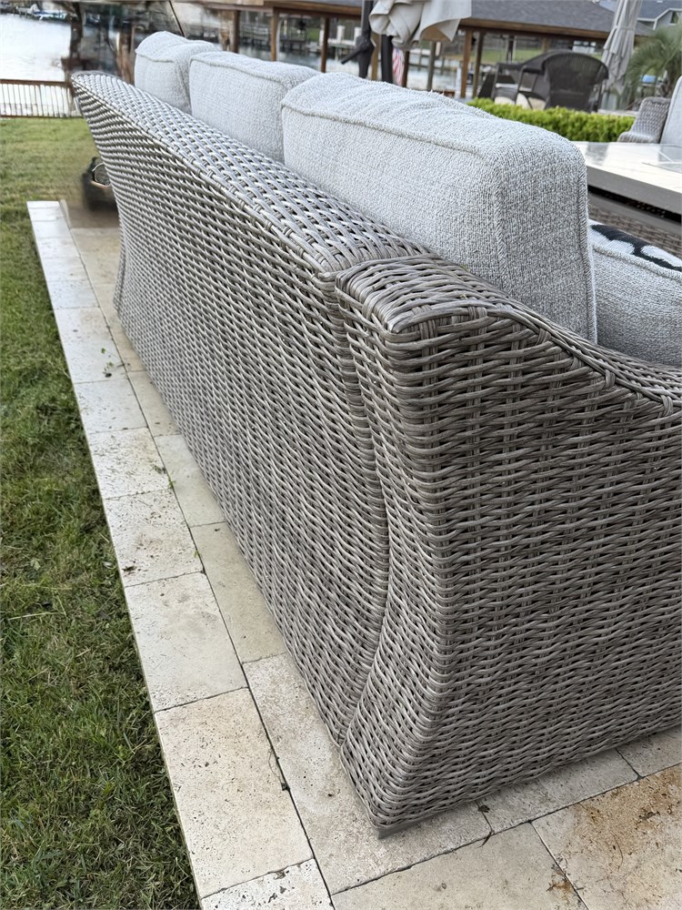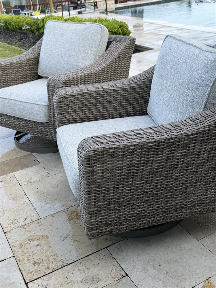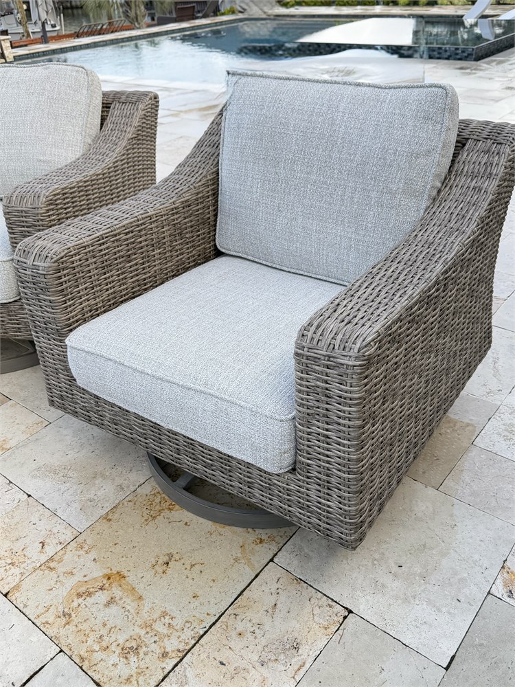 Set Includes = Sofa 30” H x 82” W x 37” D ~ Fire Pit Table 25” H x 58” W x 30” D ~ (2) Swivel Lounges 29” H x 39” W x 37” D ~ Cushions and 5” D ~ Cushions are removable for easy storage ~ Dog friendly home ~ Has been disinfected, deodorized & sanitized ~ Client states the fireplace does work