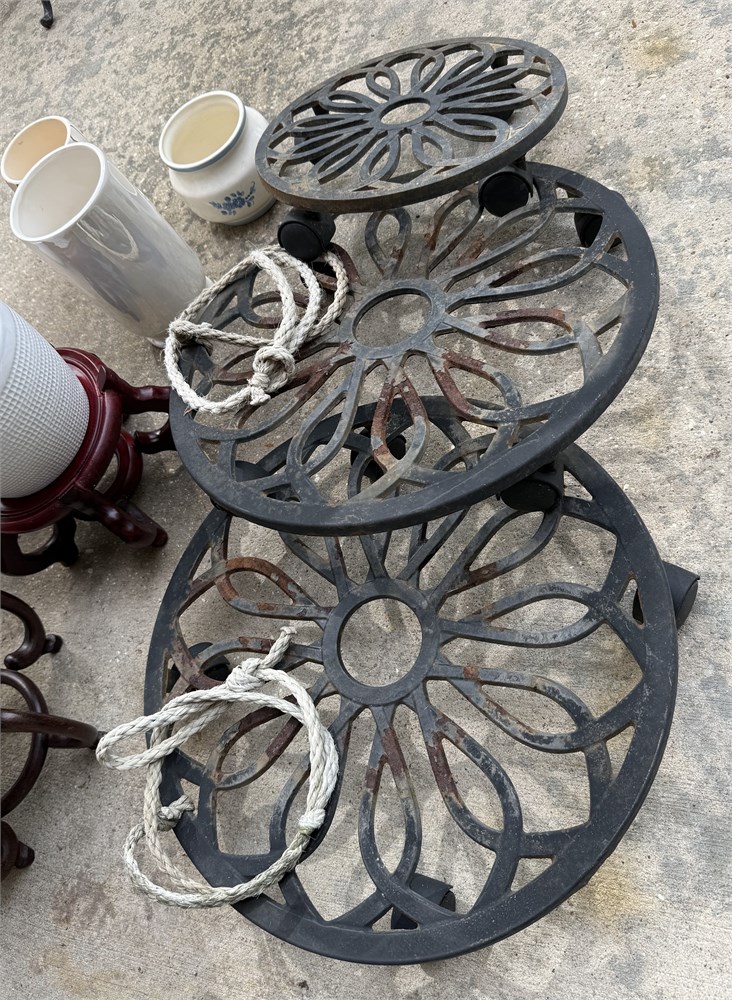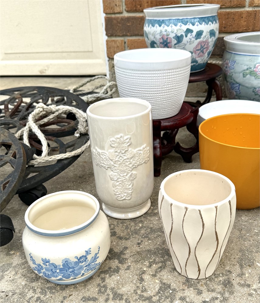 Includes 10 Ceramic Pots, 2 Heavy Vintage Cast Iron Plant Stands, 3 Rolling Iron Plant Stands, and 2 Round Brown Wooden Stands.