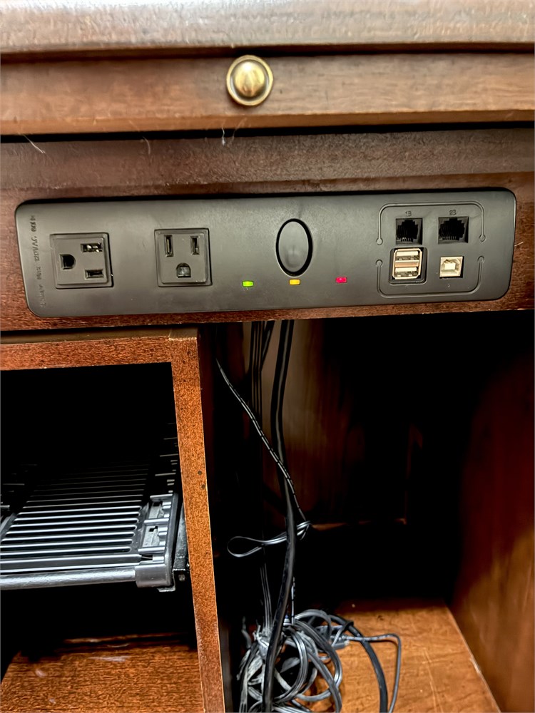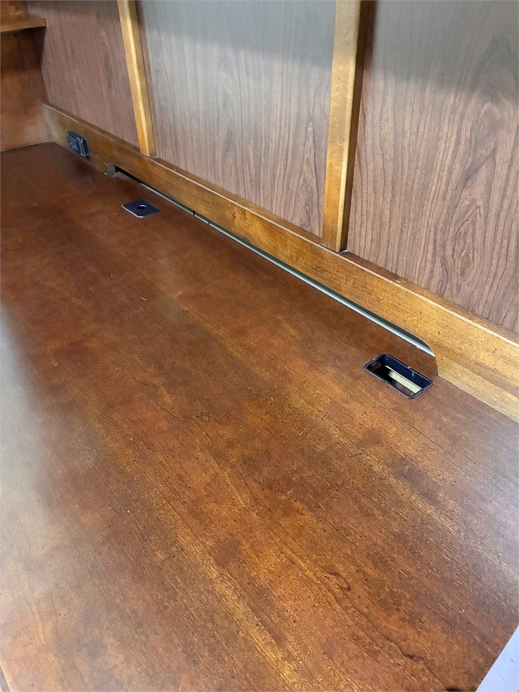 This 2-piece set has many features as you can see ~ Top shelves are glass ~ Top lights have a regular and dim setting ~ Plenty of pre-drilled openings for wires ~ Glass has minor surface scratches ~ Desk alone stands appx 30.5” H x 73” W x 24” D ~ Hutch is 54” H x 71.25” W x 15.25” D