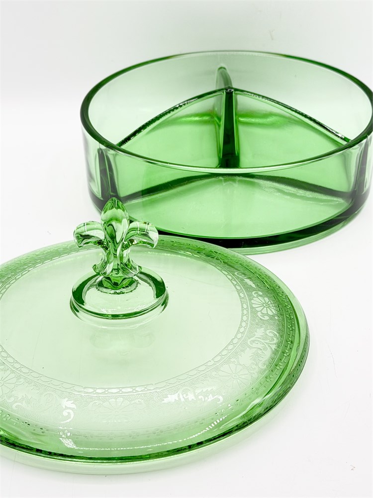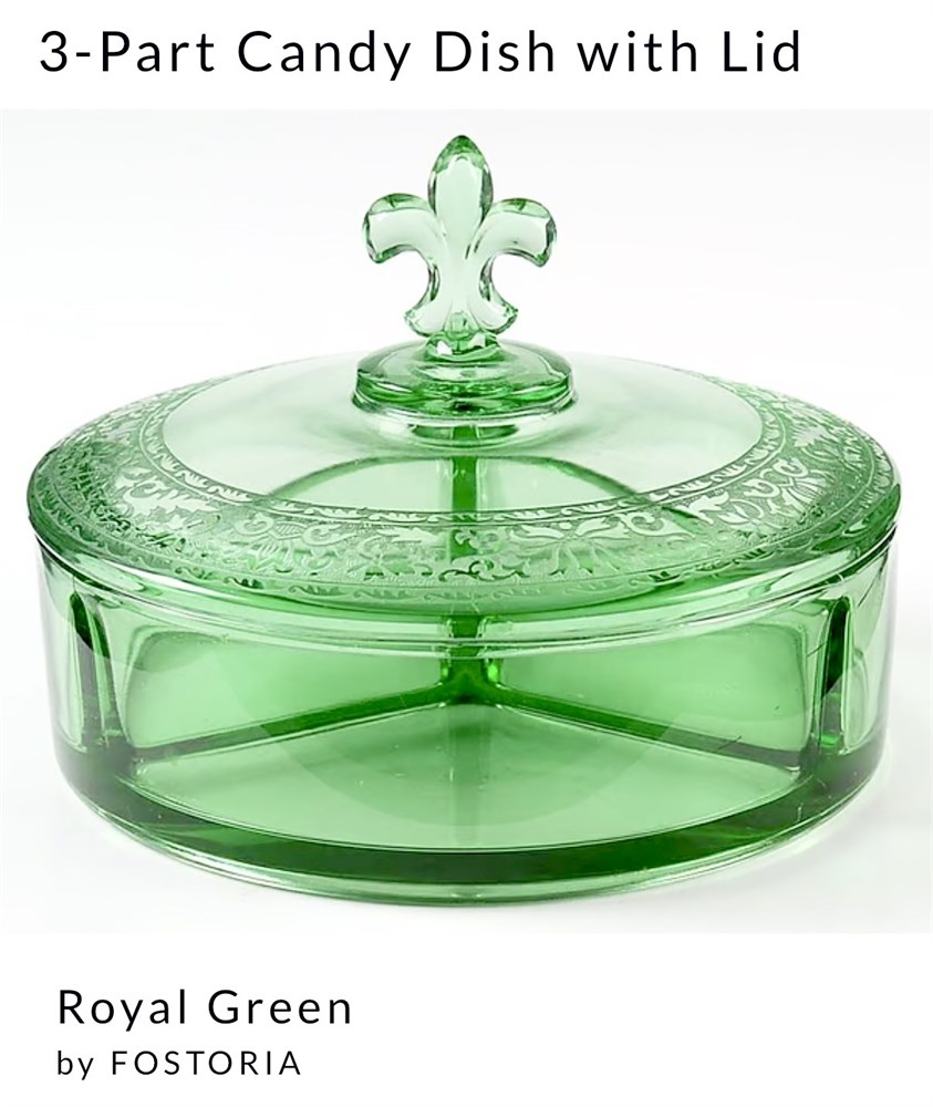 FOSTORIA ~ Royal Green ~ 3-Part Candy Dish With Lid View Watchlist >