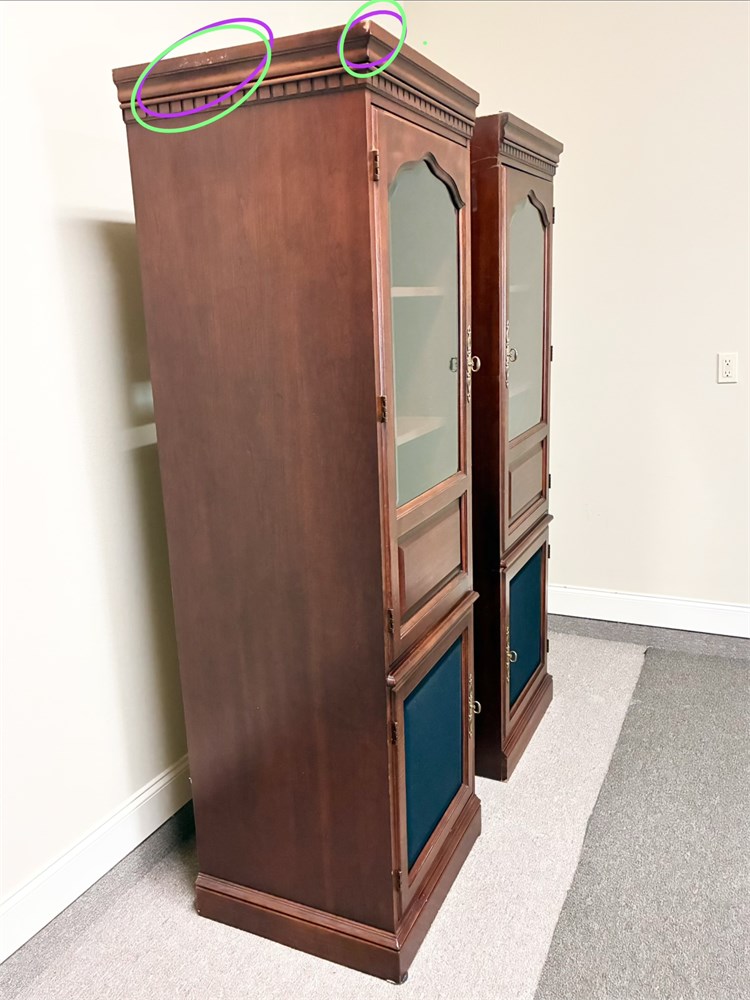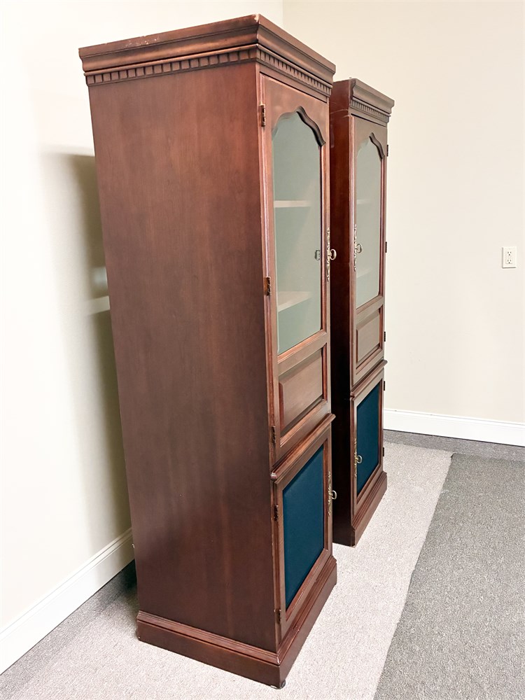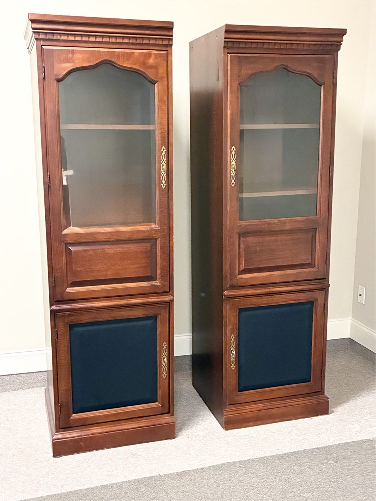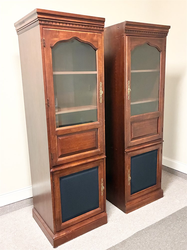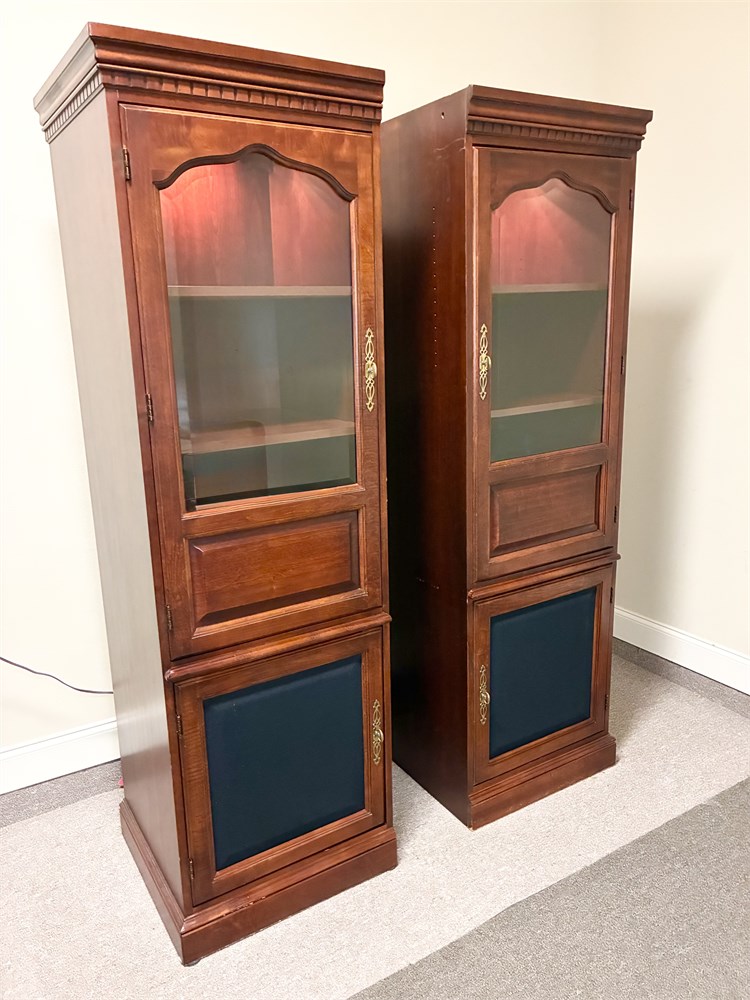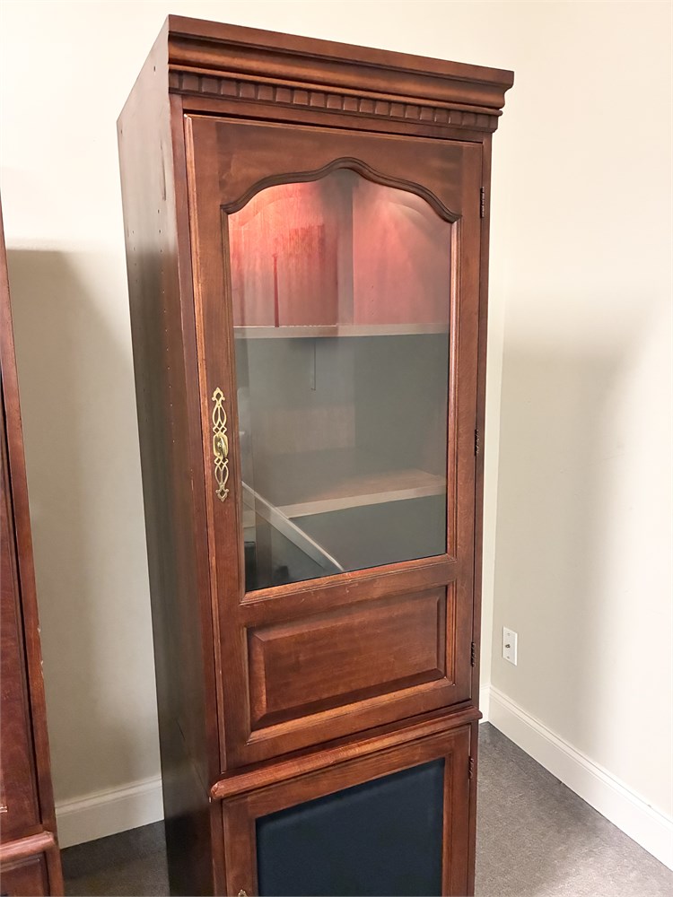 Cabinets are the ends of an entertainment center ~ One stationary shelf in each, all others are adjustable ~ Glass has beveled edges ~ 3 shelves do not have shelving pegs, will need to purchase more ~ Each cabinet is appx 77” H x 23.5” W x 22” D ~ **There is minor wear, see photos.