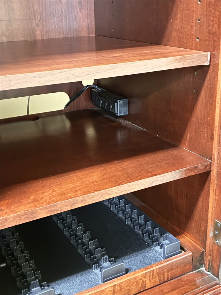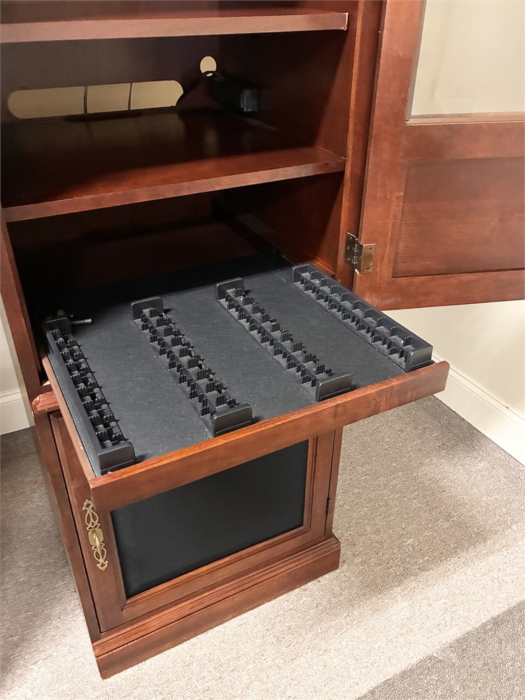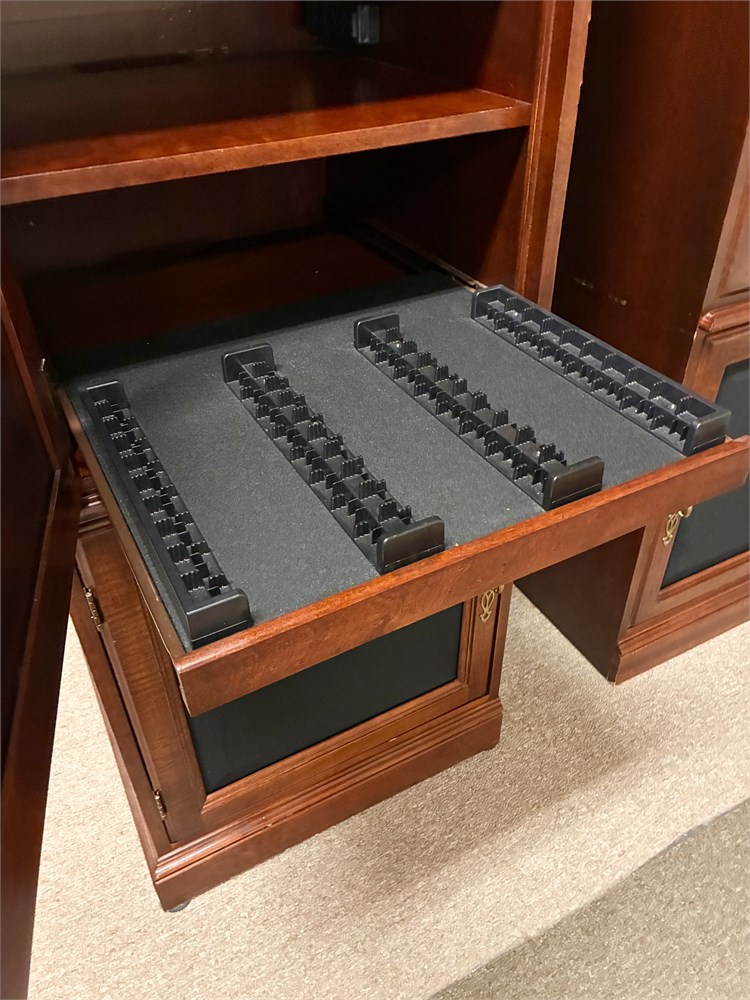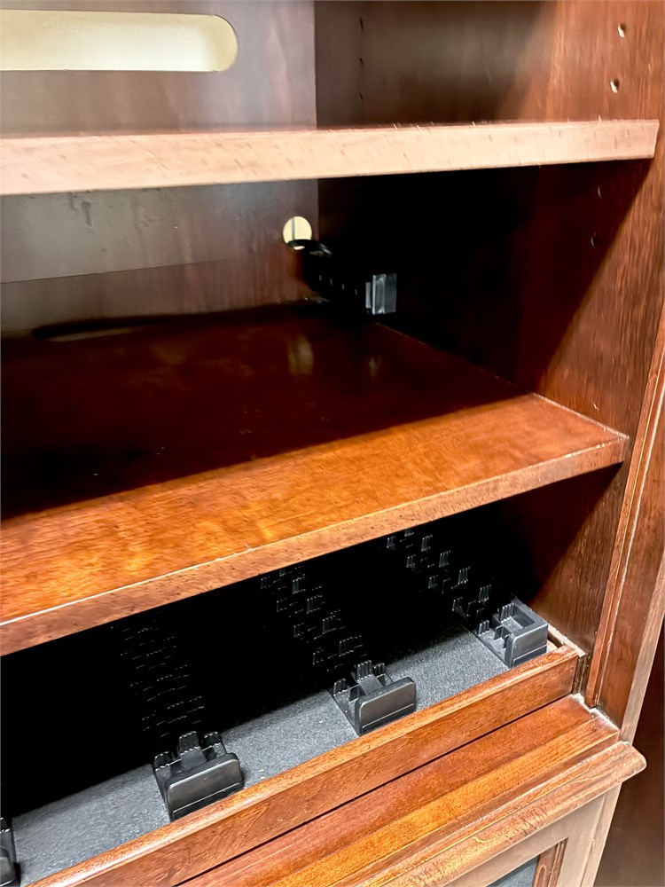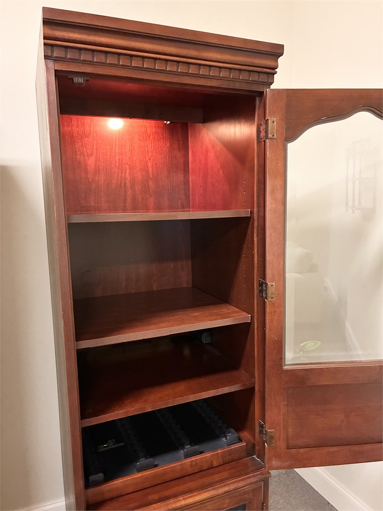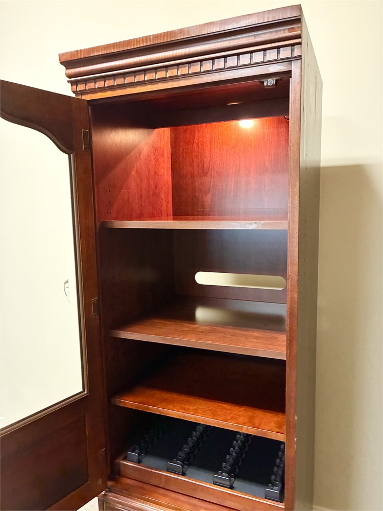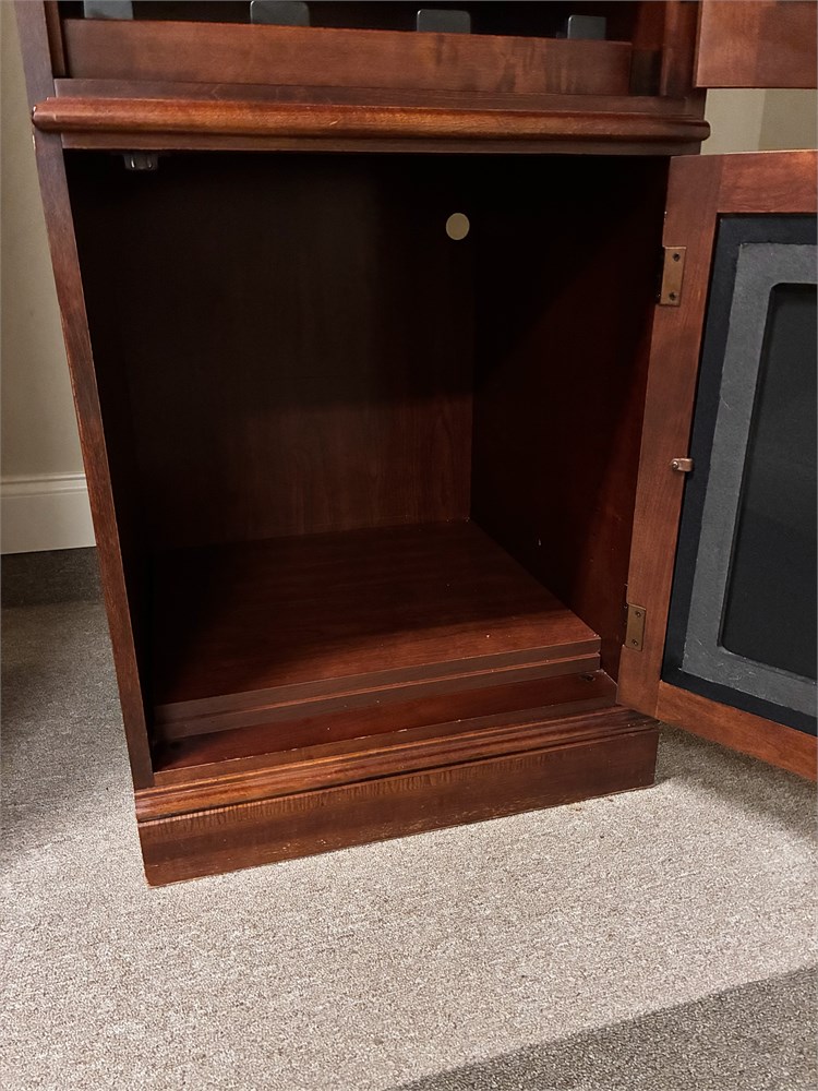 Cabinets are the ends of an entertainment center ~ One stationary shelf in each, all others are adjustable ~ Glass has beveled edges ~ 3 shelves do not have shelving pegs, will need to purchase more ~ Each cabinet is appx 77” H x 23.5” W x 22” D ~ **There is minor wear, see photos.