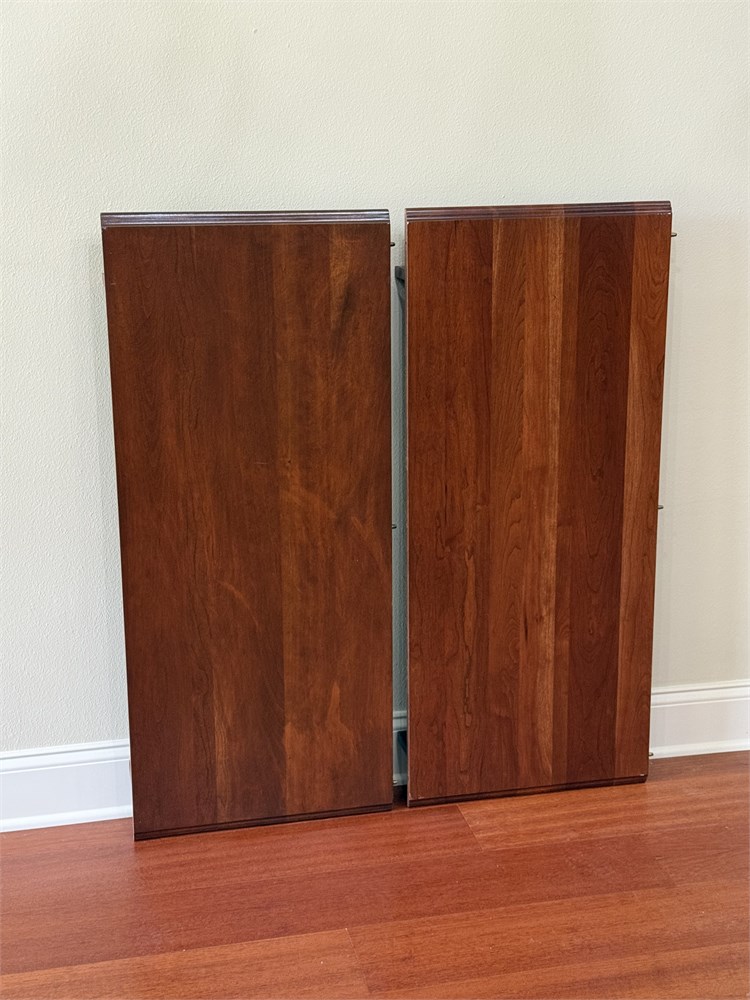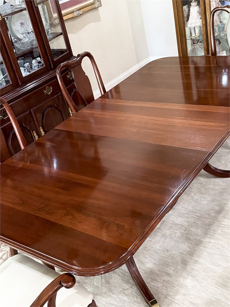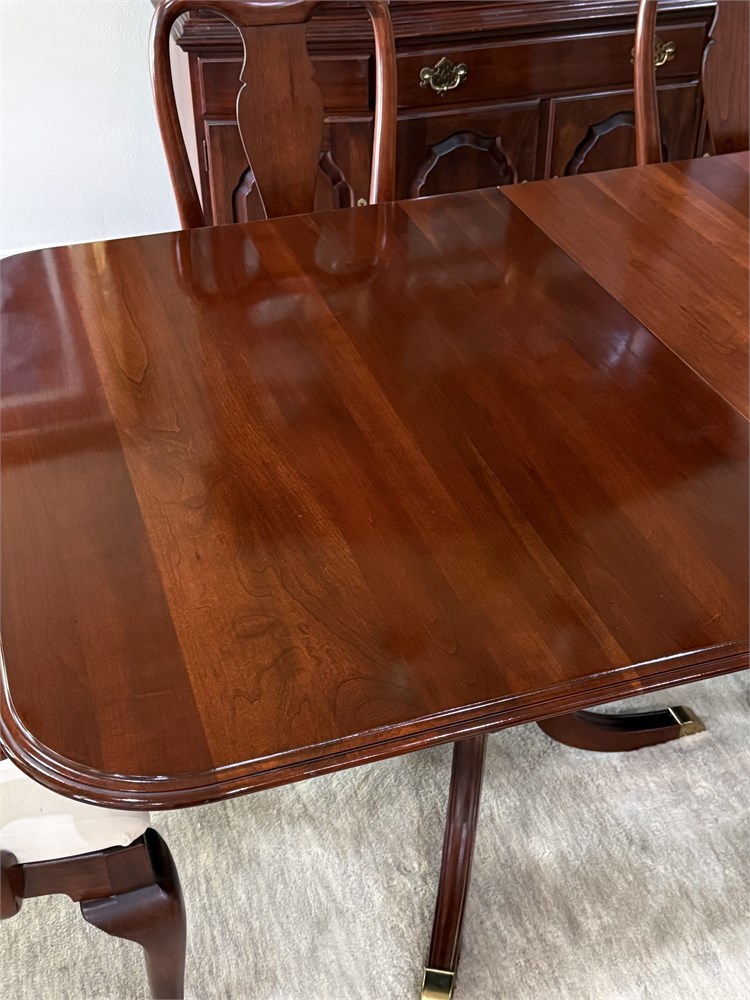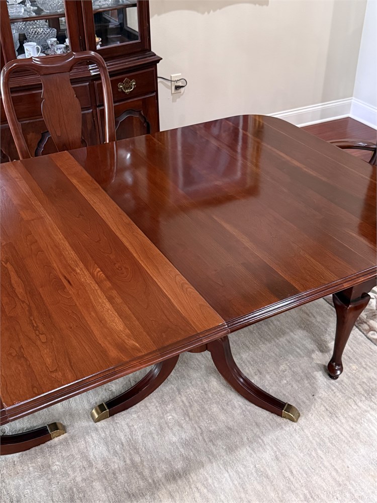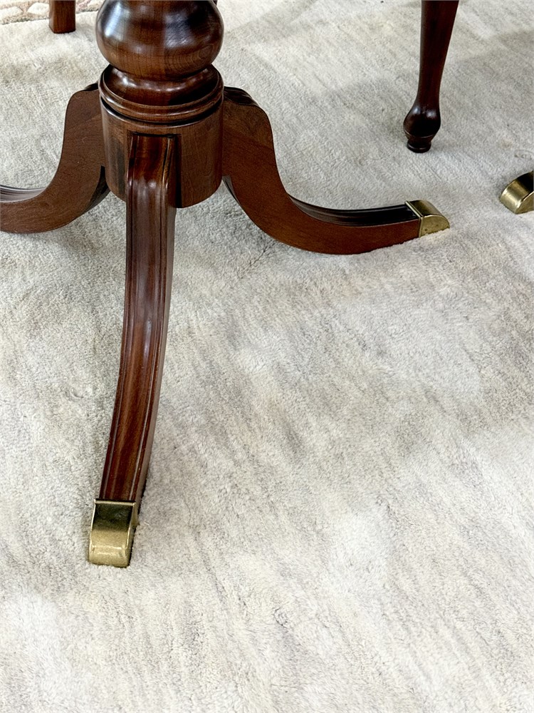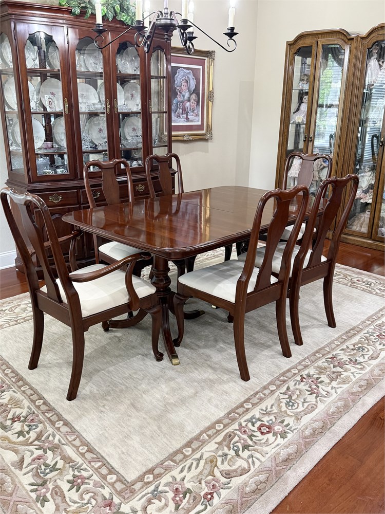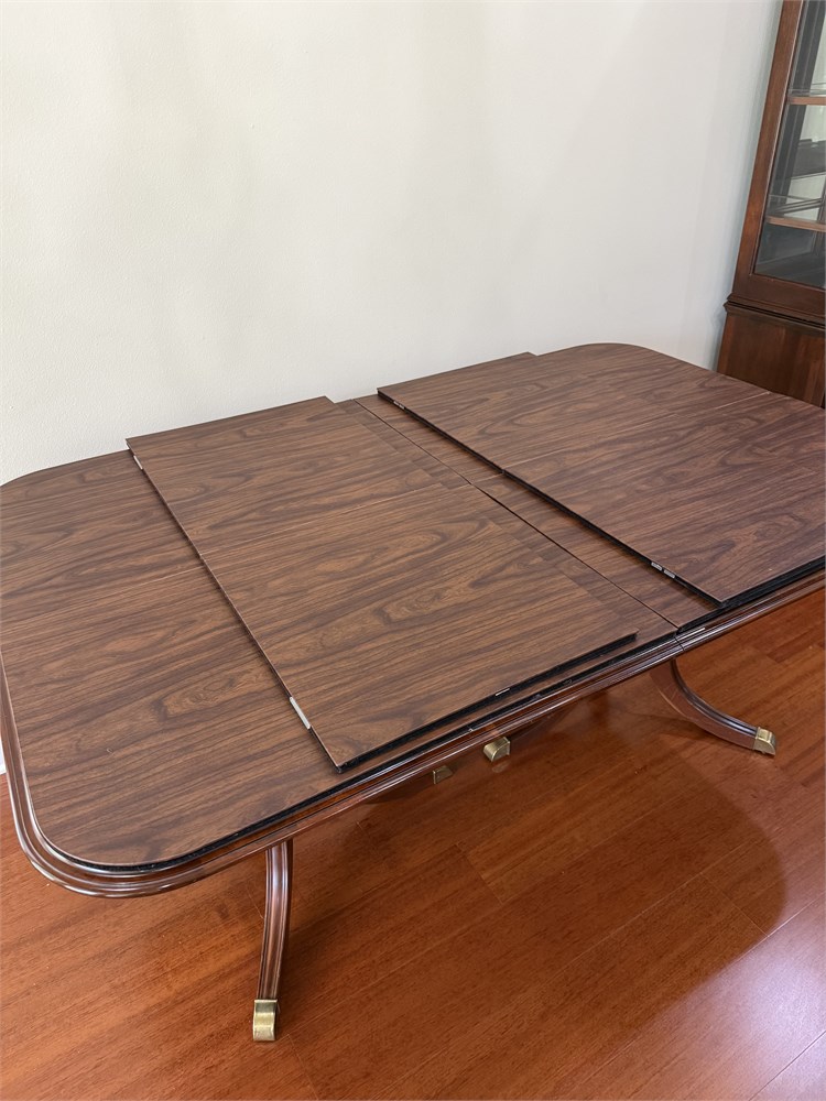 Set includes: Double pedestal brass footed table, 2 captain's chairs, 4 regular chairs, & (2) 18” leaves ~ Also has protective pads for table & both leaves ~ *Leaves are not the exact color of the table & the chairs need additional cleaning or reupholstered, see photos ~ Everything else in the photos is being sold separately ~ Table without leaf = 30” H x 66.25” W x 42.25” D ~ Captain's chairs = 40” H x 26” W x 25” D ~ Regular chairs = 40” H x 20.5” W x 23” D ~ No smoking, no pets