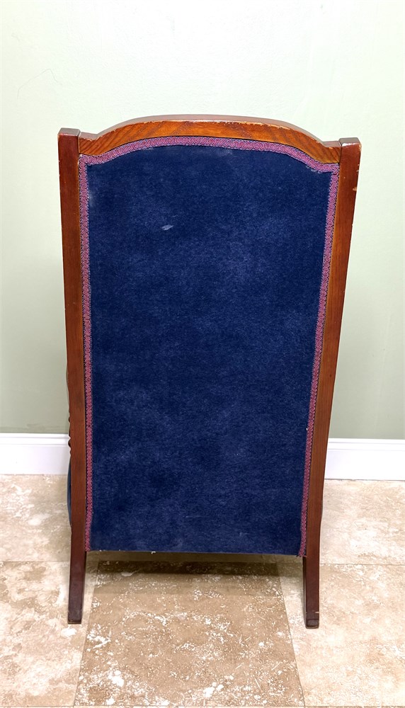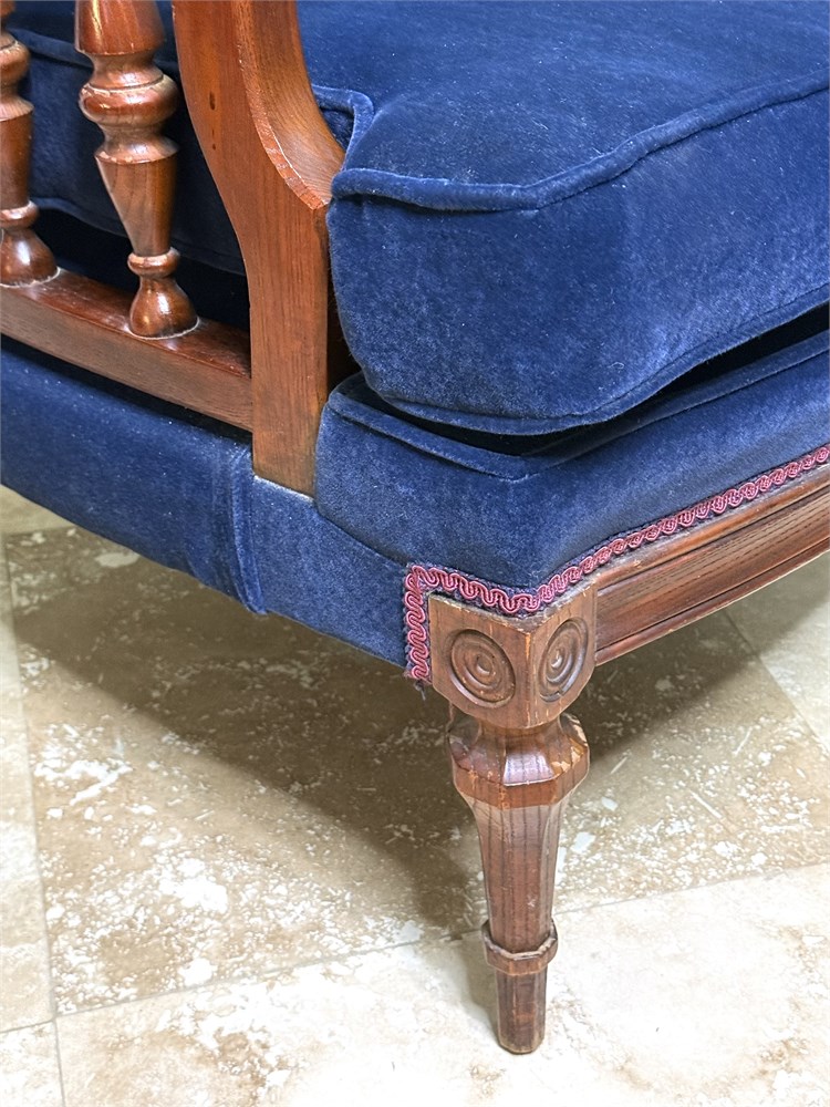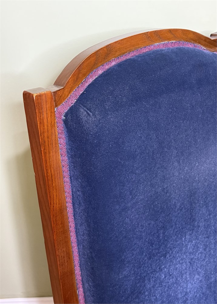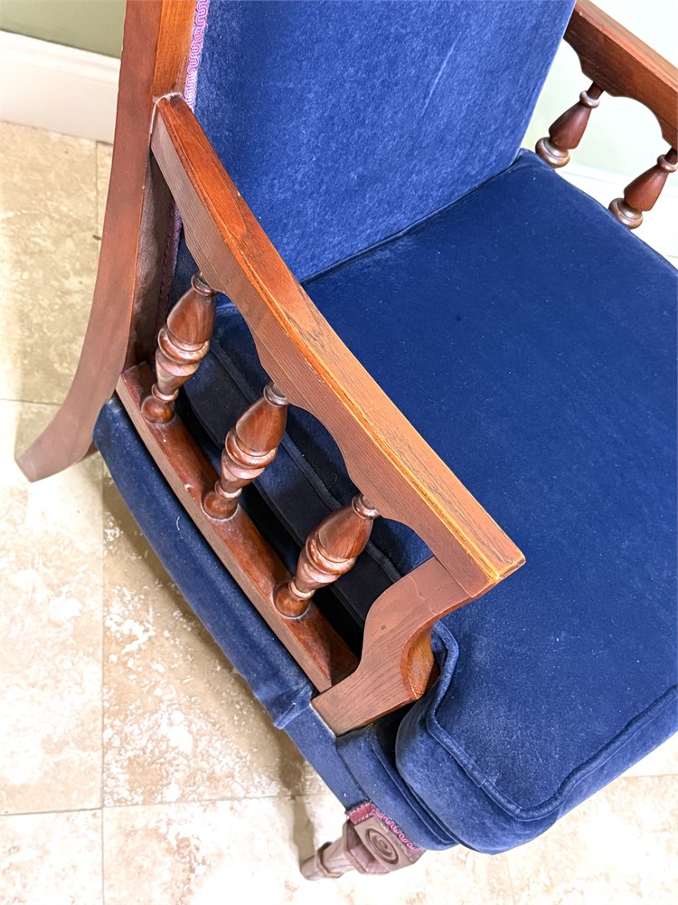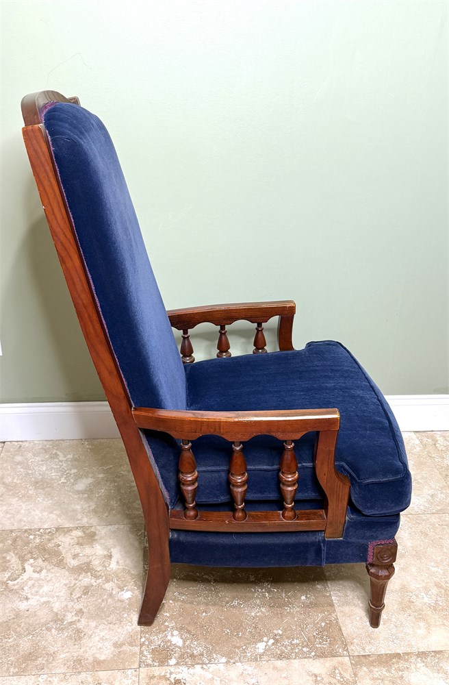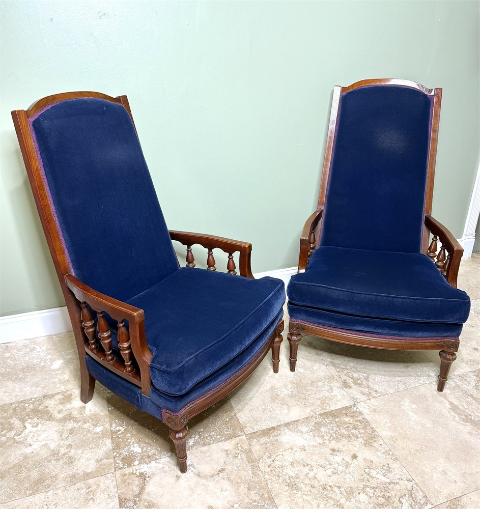 Set of 2 Vintage Blue Velvet High Back Victorian Hardwood Chairs w/ Spindle Arms View Watchlist >